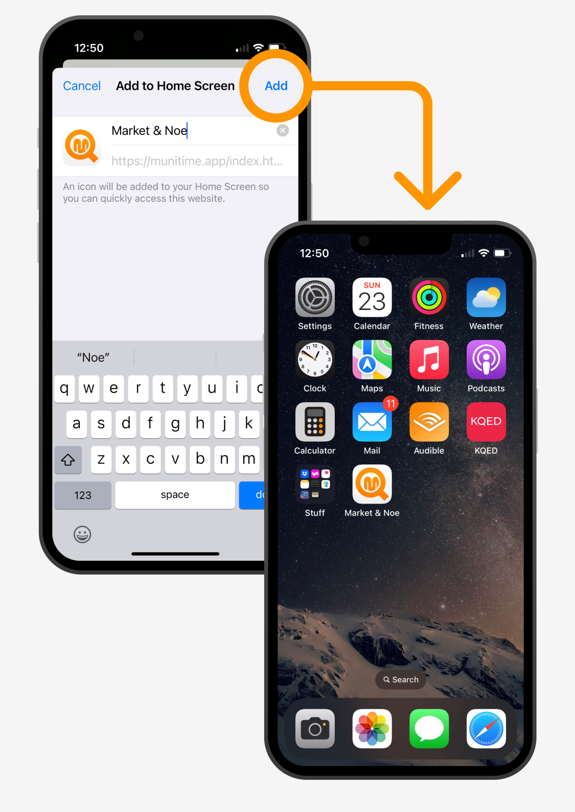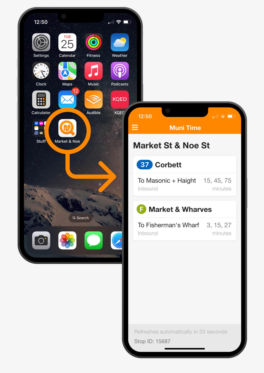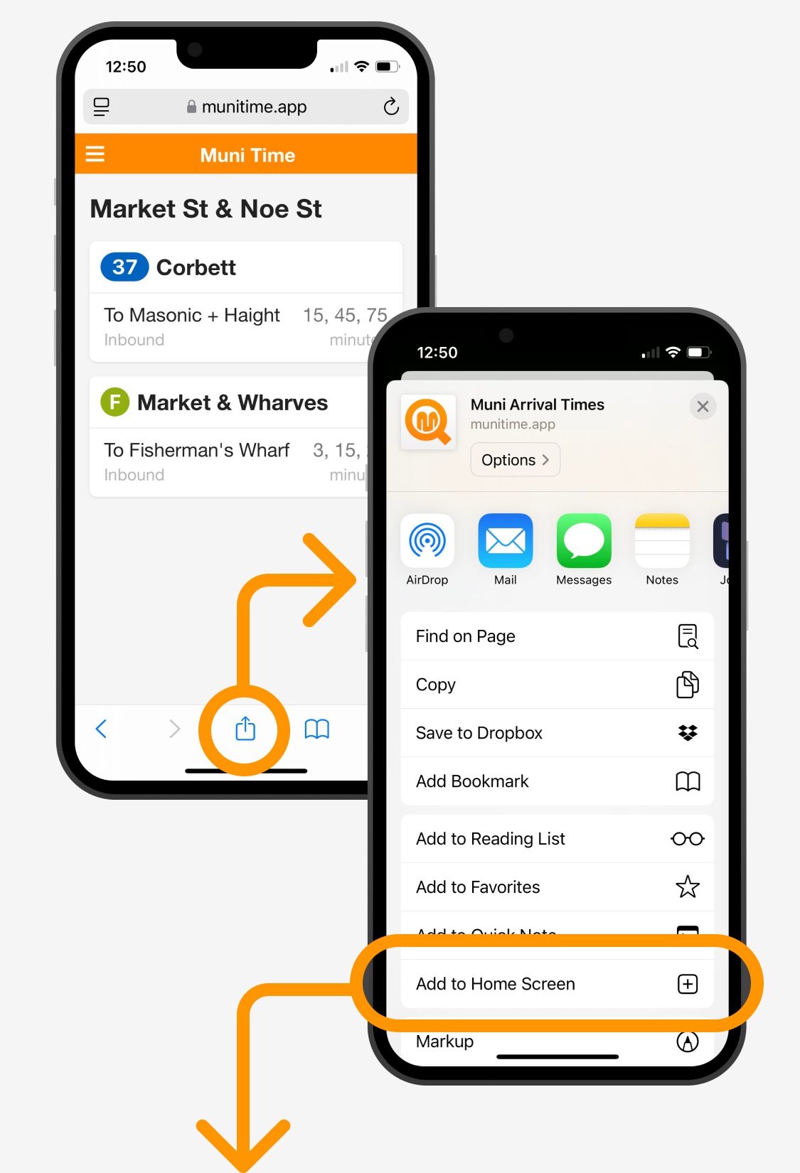 Muni Time lets you create separate home screen bookmarks for your more used stops and takes advantage of a feature in both Android and iOS to launch them like a native app, in a full-screen mode without the standard browser tools or address bar.