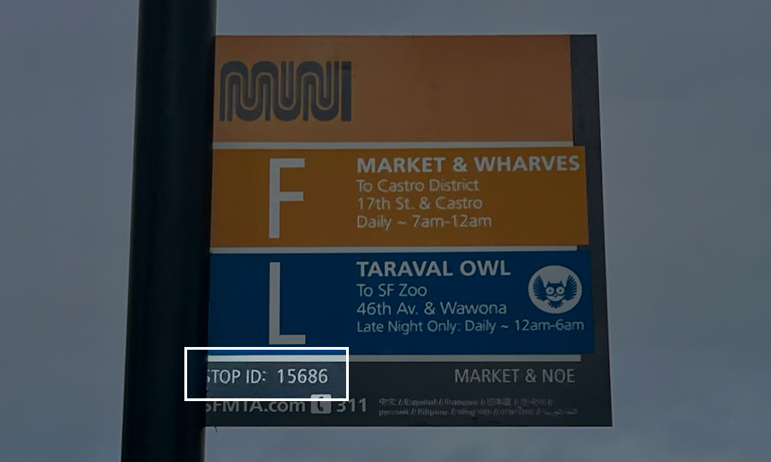 Each San Francisco Muni transit stop has a unique ID number you can use to look up arrival time predictions.