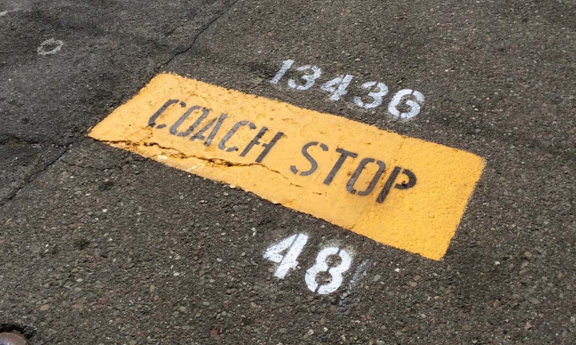 At stops marked by a yellow bar painted in the street instead of a sign, the stop ID number is often stenciled above in smaller-size white numbers.